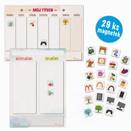 Tato sada obsahuje týdenní plánovací kalendář a to-do tabulku ve formátu A4, doplněné o základní sadu 29 obrázkových magnetek. Dítě si díky nim snadno sestaví program na celý týden, zaznamená důležité úkoly a získá jasnou představu o tom, co je potřeba zvládnout.